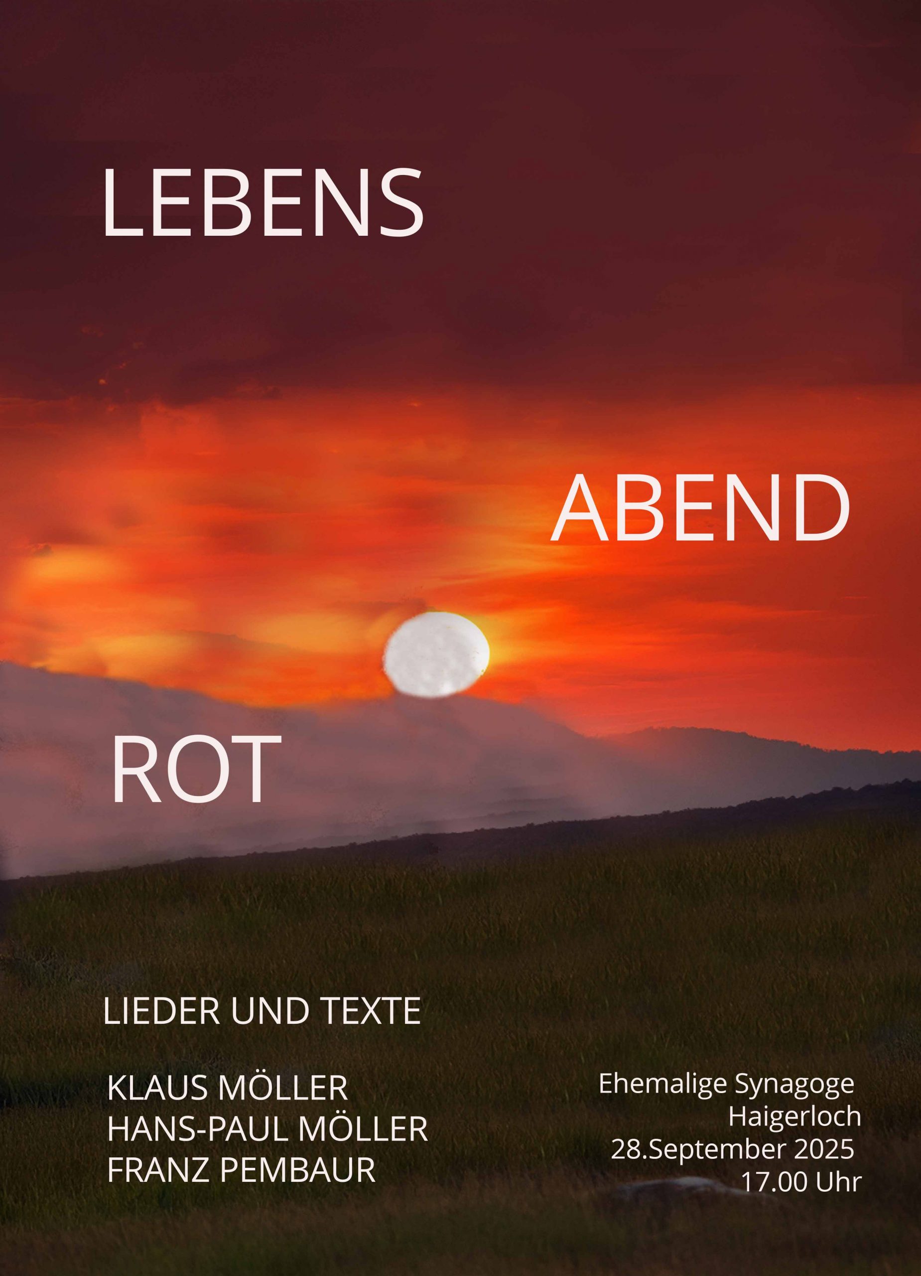 Unsere Lebenszeit als einen Bogen zu sehen, der sich wie ein Tagesablauf aufspannt… und so beim Abend, beim absehbaren Lebensausklang zu landen… die sinkende Sonne, ein Abendrot zu betrachten… So etwa versammeln sich die Texte und Lieder in unserem Programm: Wir verdanken sie Sara Teasdale und Bertolt Brecht, Franz Schubert und Johnny Cash, Wilhelm Busch und William Shakespeare, Carl Löwe und Hank Williams, Ite Liebenthal, Alfred Döblin und einigen weiteren, die Töne und Worte dafür gefunden haben.